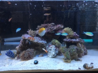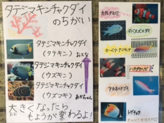 魚やサンゴを増やしました。小さな空間が、幻想的な世界を作っていて、じっと立ち止まって眺めている子もいます。いやされますよ!飼育栽培委員会の児童が、魚の名前などを調べて掲示してくれました。
