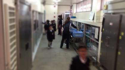 おいしく食べたあとは、係当番が片付けします。何もかも初めてなので、先生に教わりながらがんばっています。