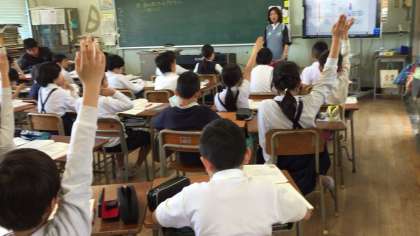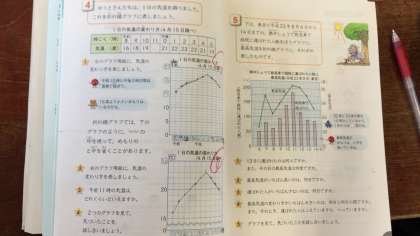棒と折れ線の2つを重ねたグラフの学習をしました。大型テレビ画面にも映し出して、理解を深めました。