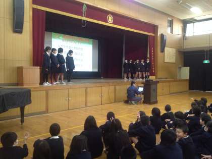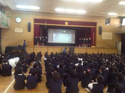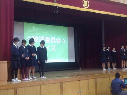 児童集会で放送委員会が、活動の様子を発表しました。普段どんなことに気を付けて活動しているかを分かりやすく発表した後は、楽しい「放送委員会クイズ」も。学校をよりよく、楽しくするために、いろいろな委員会が毎日頑張って活動しています。