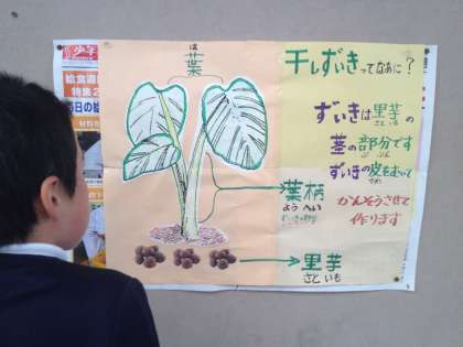 今日の給食の煮物にずいきが出ました。みんなにはちょっと苦手かもしれないのですが、体にはとってもよい食材です。給食室前に掲示しているので、見てくださいね。みんなが食べやすいように、細かく刻んで調理しています。