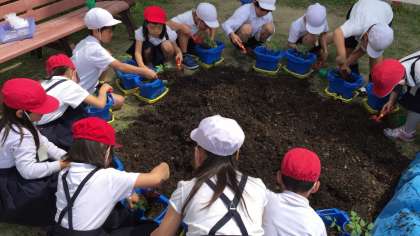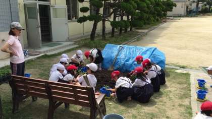 植木鉢にミニトマトの苗を植えました。苗を触るだけで、手にはトマトのにおいが付きました。大きく育つよう毎日世話をします。
