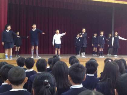 4年、5年の代表委員が舞台に立ち、自分たちで考えた振付を手本として見せながら「カントリーロード」をみんなで元気いっぱい歌いました。当日6年生が喜んでくれるとうれしいですね。