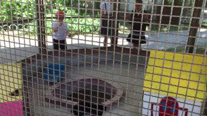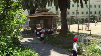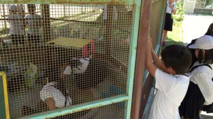 休み時間にはうさぎを見ようと子どもたちが集まります。昼休みには、飼育栽培委員がエサやりと掃除をします。いつもはかくれていますが、エサを見ると小屋の中を飛び跳ねています。