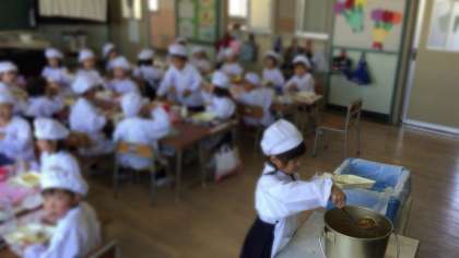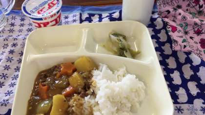 今日の給食はカレーでした。給食調理員さんがひと手間かけて、にんじんを星やハートの形にして下さりました。おかわりして、もりもりたくさん食べました。