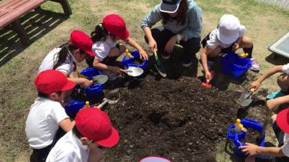 植木鉢に土を入れて、アサガオの種をまきました。土の感触を肌で感じながら、小さな種を丁寧にまくことができました。芽が出てくるのが楽しみです。