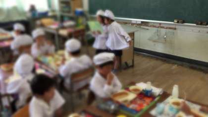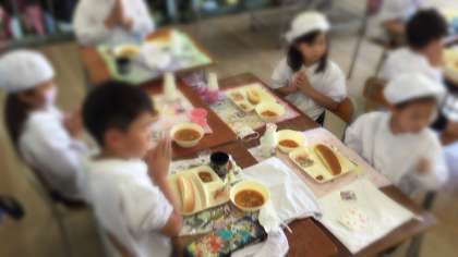 当番が教室の前でメニューを読み上げ、「いただきます」