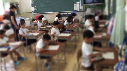写真は算数のテストと図工のようすです。画用紙いっぱいに「花とみどりの絵」を描いています。