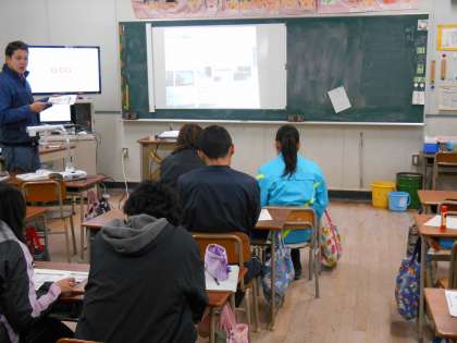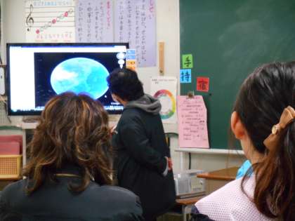 今日の放課後、ICTの研修会を開きました。タイマー機能、メモリの拡大提示、デジタル教科書への書き込み、音楽ソフトで合唱・器楽指導、グーグルアースを使った社会科指導などの研修です。今年は、ICTの得意なT先生の推進で、自主的に教え合い、学び合う研修会を開くことができました。「明日から早速学級で使ってみたい。」「子どもたちが喜んで取り組みそう!」「町探検学習にいいね!」など、とても意欲的な「がんばる先生たち」です!