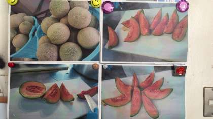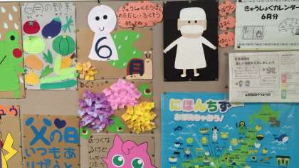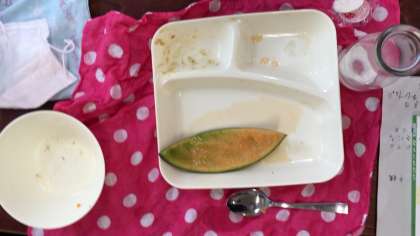 今日もおいしくいただきました。クインシーメロンがどんなものか分かるように、調理員さんが写真を掲示していました。掲示板は6月バージョンになっています。