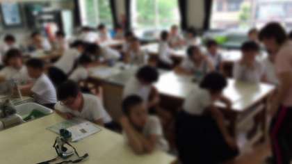 理科は双眼実体顕微鏡でメダカの卵を観察。観察中に卵がかえって誕生のようすも見られたようです。