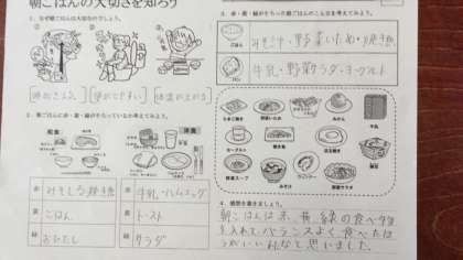 「朝ごはんの大切さを知ろう」のテーマで学習しました。バランスよく食べるために、赤黄緑がそろった献立を考えました。