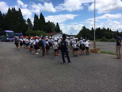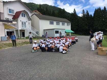 宿舎に無事到着。バス酔いなく、元気です。開舎式の後、昼食です。