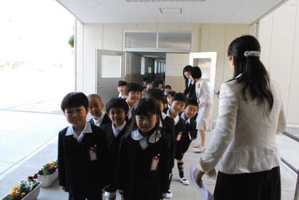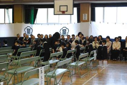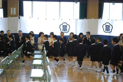 緊張した面持ちで、担当の先生の誘導で式場に入った1年生。みんなが大きな拍手で迎えました。隣にすわったおともだちともすぐなかよしに。