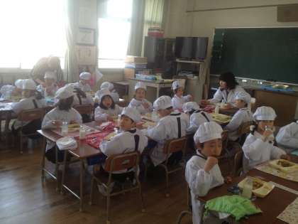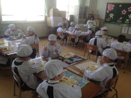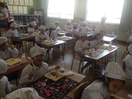 今日から給食がスタートしました。今日の献立は、カツカレー、白玉入りフルーツポンチ、ミニフィッシュ、牛乳でした。給食当番も上手にできて、「とってもおいしかった!」と大満足の1年生でした。
