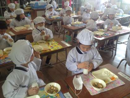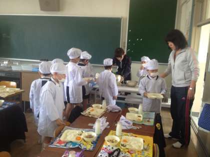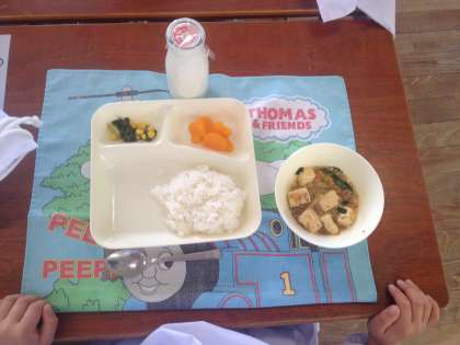 少しずつ慣れてきて、早く準備ができるようになってきました。牛乳のふたも一生懸命工夫して、一人であけることができるようになりました。苦手な時は、自分で「減らしてください」ということもできています。がんばる1年生です。
