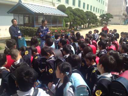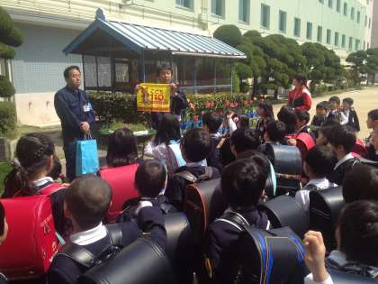 淀川区役所市民協働課のセーフティーネットの方が、安全についてお話してくださいました。「こども110番の家」については、知らない子もいました。おうちでも通学路を歩きながら、話をしてあげてくださいね。