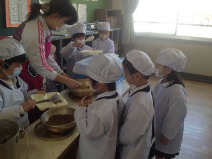 12時過ぎから1年生は、給食の準備に入ります。少しずつ慣れてきて、先生のアドバイスを受けながら、できることは自分たちで当番活動をしています。がんばれ、1年生!