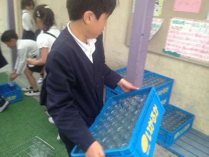 給食委員会のメンバーが、給食の牛乳を返しに来た子どもたちを誘導し、きちんと並べる手伝いをしたり、アドバイスをしたりしています。当番的な仕事のほかに、みんながもっと給食を好きになってくれるような工夫はないか、考えてくれています。