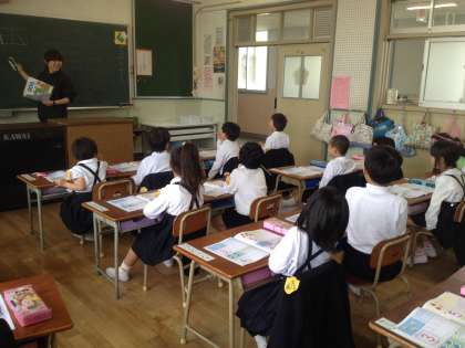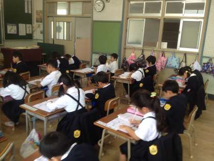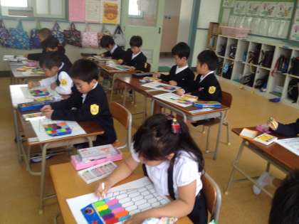 2時間目、1組は、図工の時間にこいのぼりのうろこを一生懸命パスで塗りこんでいました。指の巧緻性を高める意味でも、しっかり力を入れて塗りこみます。2組と3組は、国語で「い」の字の練習でした。姿勢、鉛筆の持ち方など、今は、基本をしっかり指導しています。