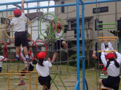 3時間目は、3クラス合同で体育をしました。遊具を使って思いっきり体を動かしました。初めは、「ちょっとこわいなあ。」と尻込みしていた子も、友達や先生の応援で少しずつチャレンジできるようになってきました。今、遊具などで体をいっぱい使って動かし、遊ぶことが、体つくりにつながります。がんばれ!1年生!!