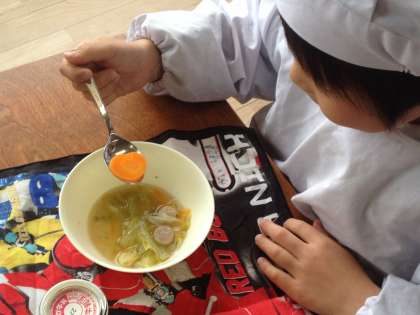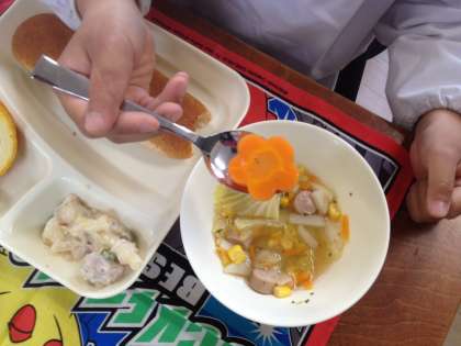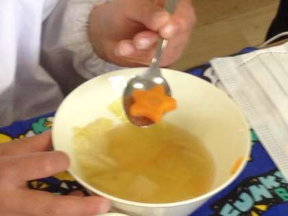 みんなが大好きなラッキーにんじん。今日は、花、ハート、星の三種類です。みんな、いいことあるかな。苦手な子もぺろっと食べています。
