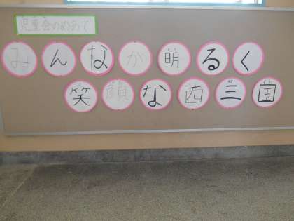 児童会の代表メンバーから、今年の児童会目標の発表がありました。「みんなが明るく笑顔な西三国」です。いろいろ楽しい活動を計画して、みんなで楽しい西三国小学校にしていってくれることを期待しています。