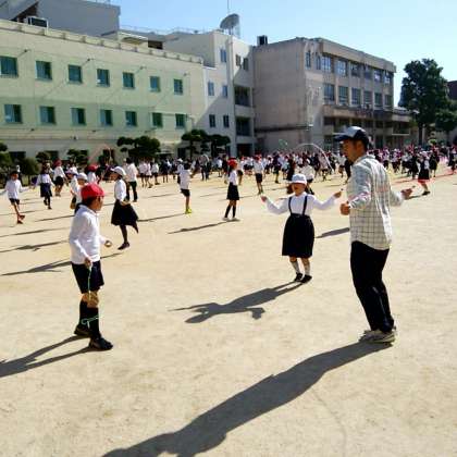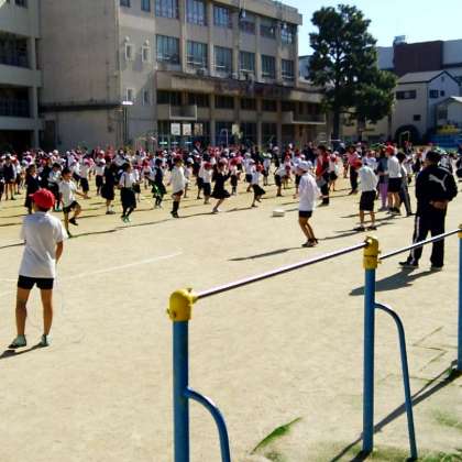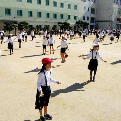 2時間目のあと全校児童が運動場に出て、なわとびをしました。今週はなわとび週間です。
