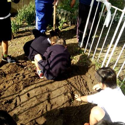 サツマイモを掘りました。土を触る感覚を楽しみながら、サツマイモをさがしました。収穫を喜び合いました。