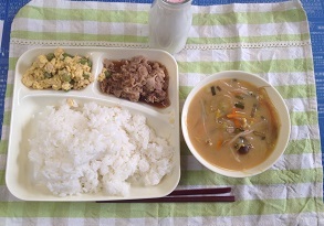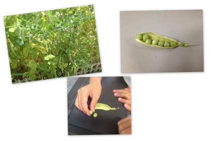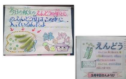 9日(金)の給食には、「えんどう豆の卵とじ」が出ました。えんどう豆のことを知ってもらうために、調理前の豆を給食室前に掲示しました。中庭にもちょうどたくさんえんどう豆ができています。給食後教室で、豆が何個入っているか調べていました。多いものでは、13個も入っていました!