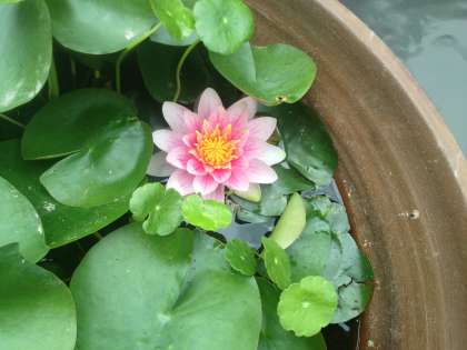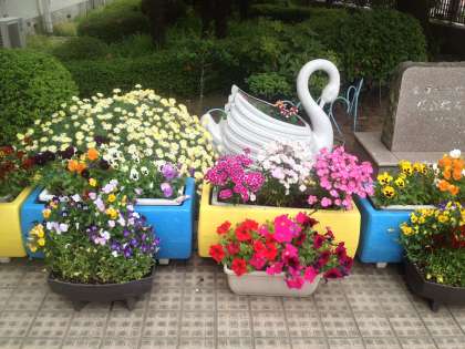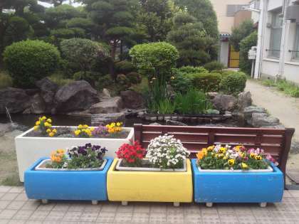 スイレンの花が咲きました。スイレンとハスは、葉っぱに切れ込みがあるかどうかで見分けるそうです。池には子どもたちの大好きなカメ(カメタロウ)や鯉などがいて、癒しの場となっています。ビオラ、ナデシコが美しく咲いています。
