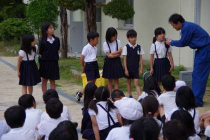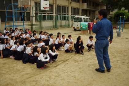 最後に代表で数名が質問しました。「一日何時間働いていますか?」「何人がかりで、何件ぐらい家を回っていますか?」「なぜ青い服を着て仕事をしているんですか?」「なぜパッカー車は、音楽が鳴っていて、いつも同じ曲なんですか?」「事故を防ぐための工夫は何ですか?」「この仕事をやっていてよかったことは何ですか?」