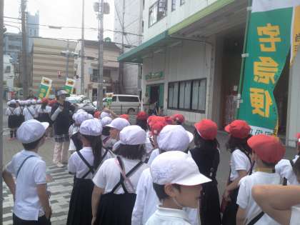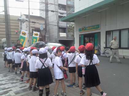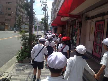 今日の2、3時間目、「町たんけん」のコースをみんなでいっしょに回りました。本番のたんけんでは、校区内のお店や素敵な場所、危険なところなどをグループで探しながら回ります。クロネコヤマトや、工事現場、十八条温泉などを見て、最後は公園に行き、少しだけ遊んで帰りました。