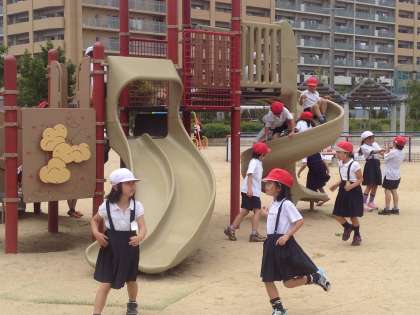 最後は公園で、きまりを守って遊びました。滑り台や砂場遊び、ハンカチ落としもしました。本番は、セーフティー淀川(区役所)の方も応援で一緒に回ってくださいますが、グループで相談しながらなかよく、しっかり、いろいろなものを一人一人の目で発見してほしいです。