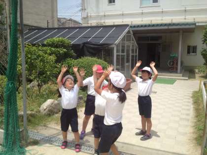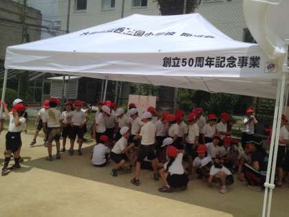 去年PTAで設置してもらったミストシャワーとテントを出しました。ミストの下で、気持ちよさそうな子どもたちです。