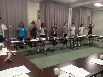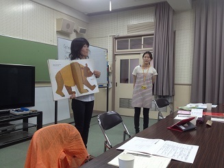 三国小学校、新高小学校、新高幼稚園などで英語活動を教えておられる伊藤先生に、本校も今年度からお世話になることになりました。耳からどんどん入れて、そして体を動かしながら楽しく英語を話し、コミュニケーション力をつけましょう!と、先生たちが子ども役になって、指導法を学びました。「恥ずかしさを捨てて、ゼスチャーなどはオーバーに!」とO先生。英語の良いところは、どの子もたくさんほめることができるところです。Good job! That is wanderful!の連発です!