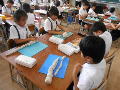図工で「粘土オリンピック」をしました。粘土をのばしたり、ちぎったり、まるめたりして作りました。