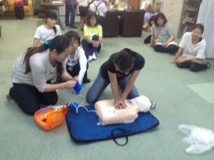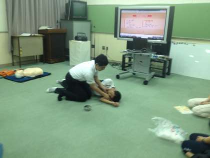 今日16時から教職員とPTA合同で救急救命講習会を行いました。今年は、応急手当普及員の認定を受けた教頭先生が講師となり、消防署からの応援(人形、AEDの貸し出し)をうけての講習会でした。毎年行っていますが、万が一の時のためにも必要です。AEDの使い方もみんなの様子を見ているうちにだんだんと慣れてきました。みなさん、ご苦労様でした!ちなみに、本校のAEDは、給食室前の手洗い場の横に設置してあり、プール水泳時は、プールサイドに置いています。