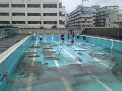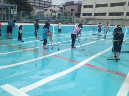 来週から始まるプール水泳に向けて、放課後職員でプール清掃を行いました。ごしごしこすってすっかりきれいになりました!プール水泳、楽しみですね。