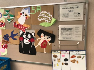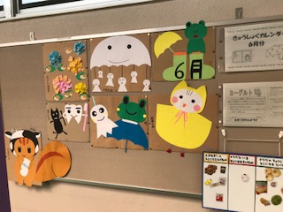 給食調理員さんたちは、子どもたちに少しでもたくさん食べてもらいたい、食に興味を持ってもらいたいという思いから、毎月給食室前をきれいに飾って、いろいろと給食にまつわる情報を提供してくれています。その掲示が非常にきれいでかわいらしいことから、子どもたちに大人気となっています。いつも子どもたちが入れ替わり立ち代わり掲示を見に来ており、給食室前は子どもの笑顔であふれています。今回は5月と6月の掲示物を紹介します。