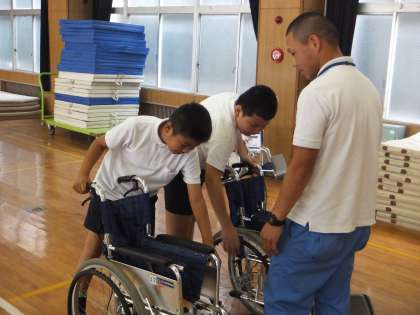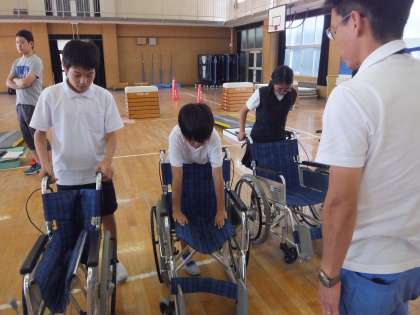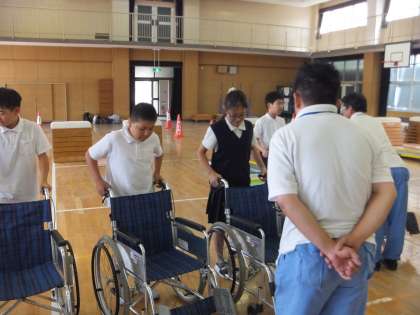 13日(金)平野リハビリセンターの応援を得て、車いすの体験を行いました。介助したり、されたりするときなど両方を体験し、見ているよりもずっと大変で、気を付けなければいけないことがたくさんあることがわかりました。車いすの開き方、閉じ方など扱い方も丁寧に教えていただきました。