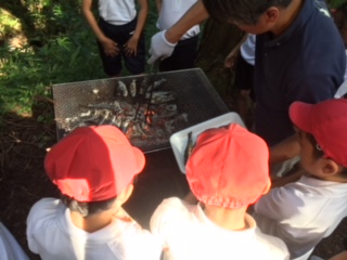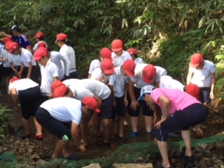 宿舎の近くの小川で魚つかみを行いました。みんなが捕まえているのはニジマスです。一人一匹捕まえます。捕まえたニジマスは洗って塩をまぶし、焼いてもらっていただきます。命をいただくということを学びました。