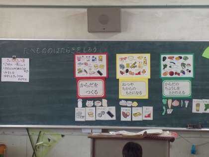 2年生は、「たべもののはたらきをしろう」というめあてで、教えていただきました。今日の給食の献立で使われているたくさんの食材を赤・黄・緑それぞれの食べ物に分類しました。のりやヨーグルトが、赤色の食べ物(からだをつくるはたらき)であることにびっくりしたり、家で「マヨネーズをかけすぎたらだめとかジュースを飲みすぎたらだめ。」とか言われていることの意味を考え直したりしている子もいました。自分で自分の食生活を振り返り、より良い方に気づき、実践できるようになるとうれしいです。お家でも機会をとらえて一緒に考えてみてくださいね。