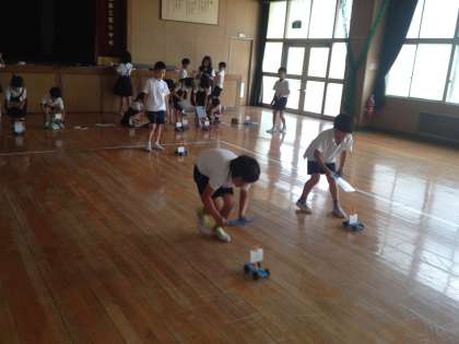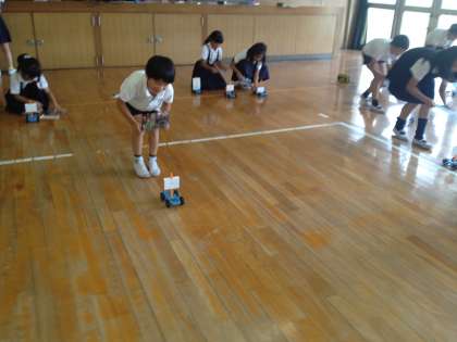 体育館で「風の力」について実験をしました。子どもたちは、風の力で物が動くことは、経験で知っています。でも本当にそうなのか、どうすればもっと速く、勢いよく走るのか