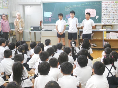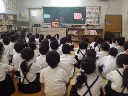 今日の昼休みは紙芝居「ふしぎなしゃもじ」でした。読み聞かせてくださったYさんは、劇団に所属されており、CM出演もある方です。1年生の子どもたちは、すっかり話にひきこまれていました。その後「うさぎとかめ」の歌を手話で歌いました。ボランティアほうせんかのみなさんは、12日の校庭キャンプの時にも小さい子ども達に読み聞かせをしてくださいます。楽しみにしています。