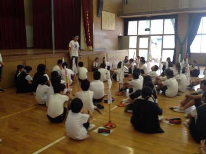集会委員会は、毎週の集会で何をするのか考え、準備をし、練習をしています。なかなか忙しいけれど、全校のみんなが楽しく、仲よくできるゲームを工夫しています。