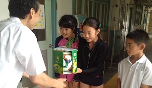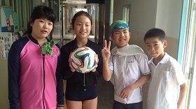 サッカーボールのレプリカを郵便局からいただきました。運営委員の代表が受け取りにっこり!ありがとうございます。職員室前に飾っています。