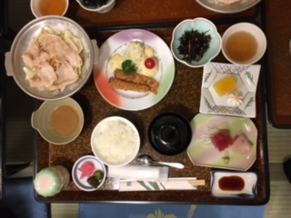 豪華な夕食の始まりです。お刺身に、しゃぶしゃぶに、エビフライ。どれもおいしそうです。