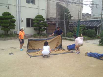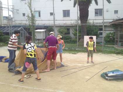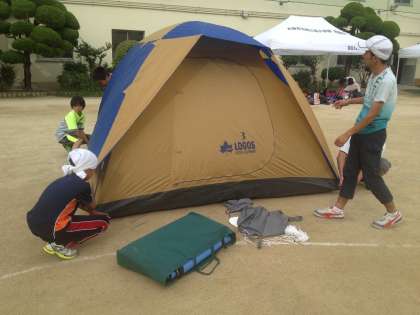 まずは、テント張り。地域の方や教員も応援に来入り、全部で10のテントを張りました。