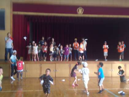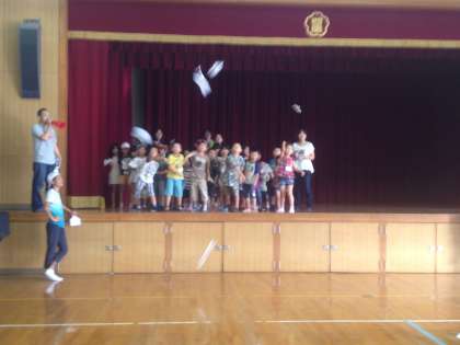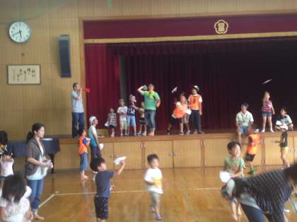 体育館では次のグループが、紙飛行機飛ばしを楽しみました。お父さん、お母さんもトライ!
